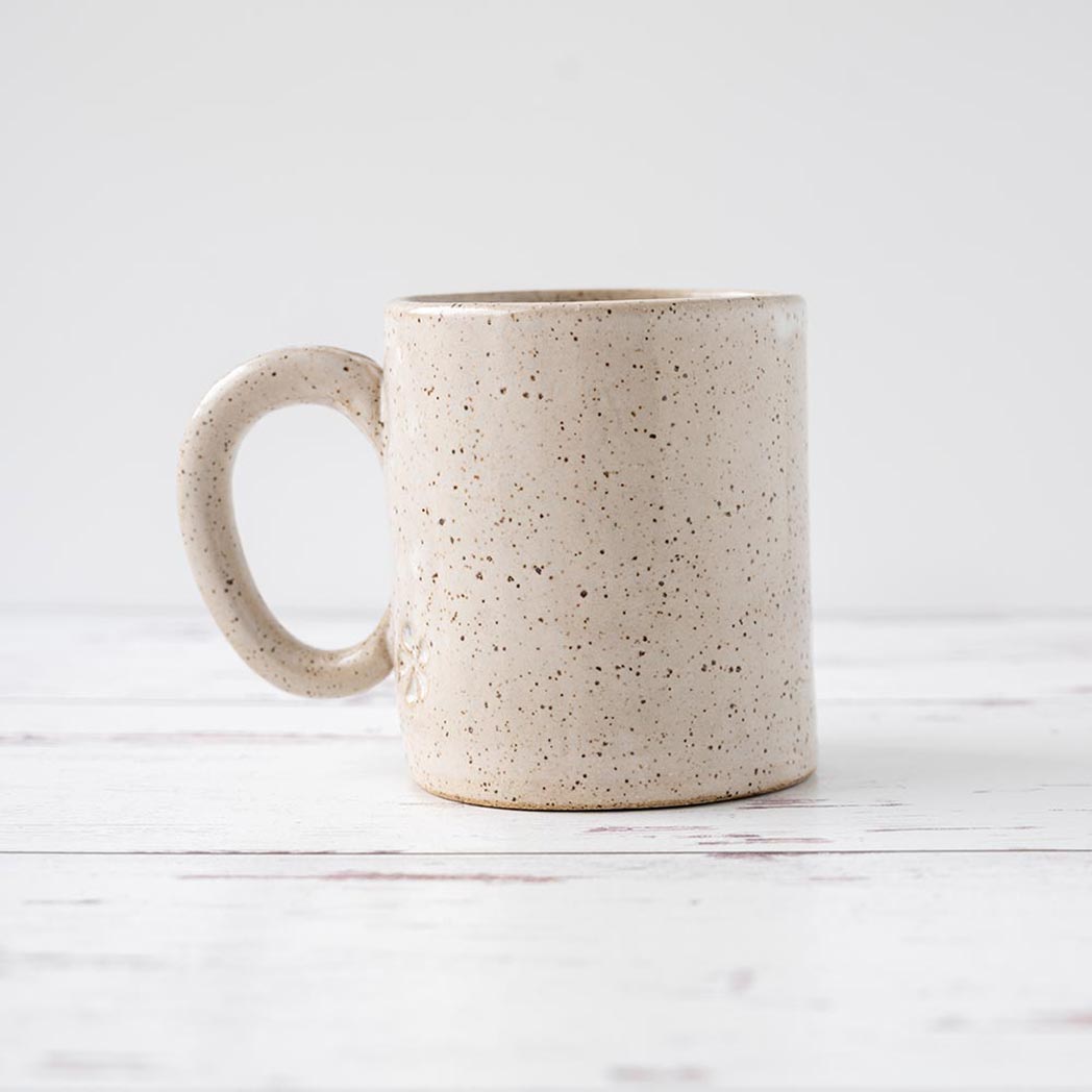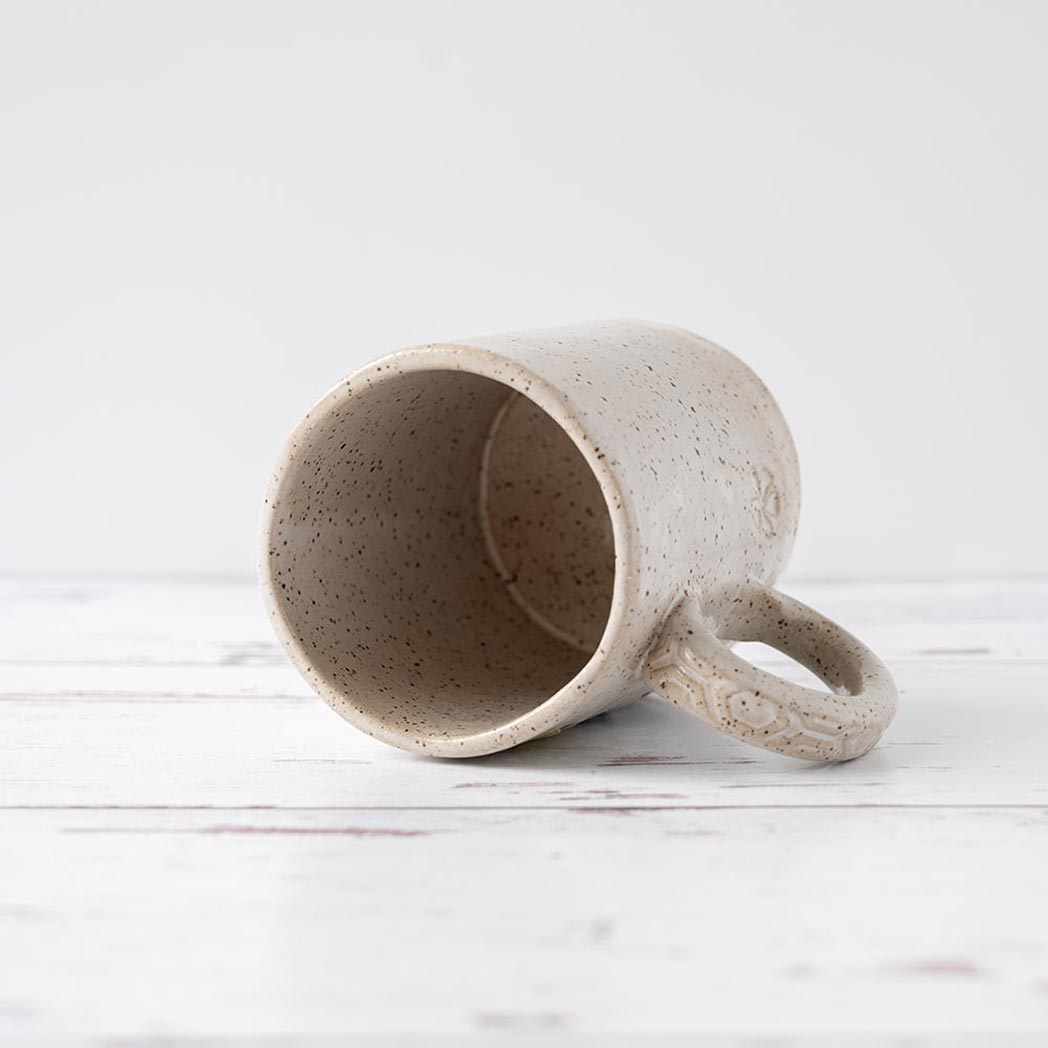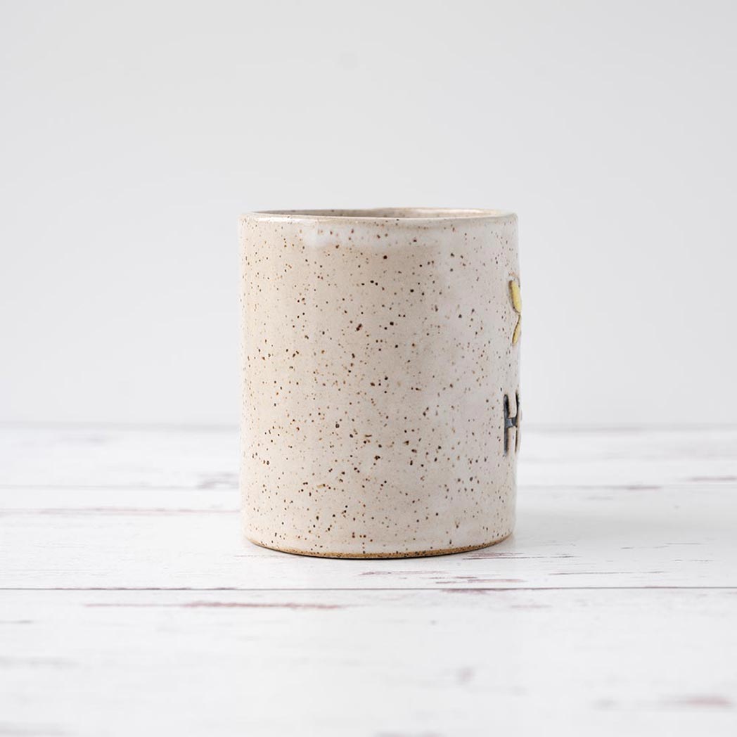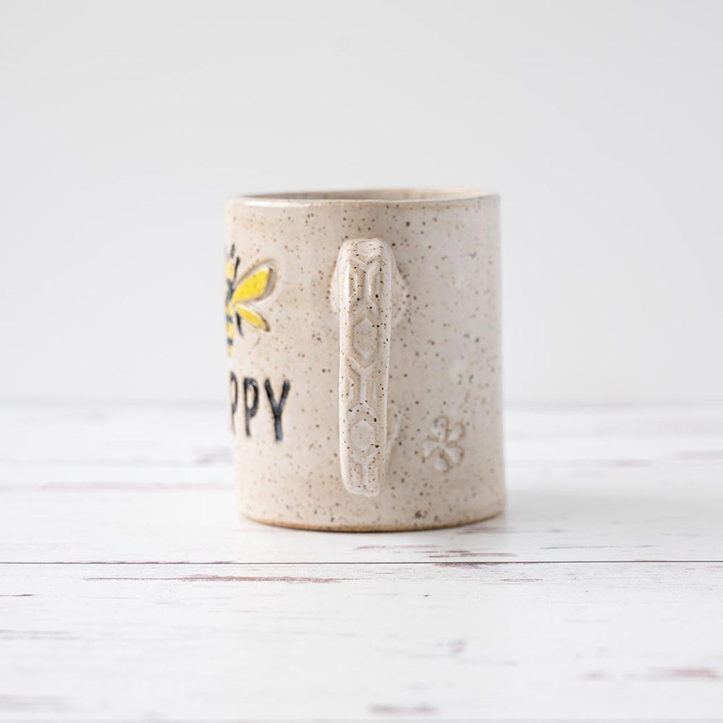 Handmade in Ohio, this beautiful white stoneware ceramic mug brings a Bee Happy Design with a detailed textured handle. Enjoy 14 oz. of your favorite coffee or tea in this unique hand-glazed mug which is both microwave and dishwasher safe which is sure to start your days off right.