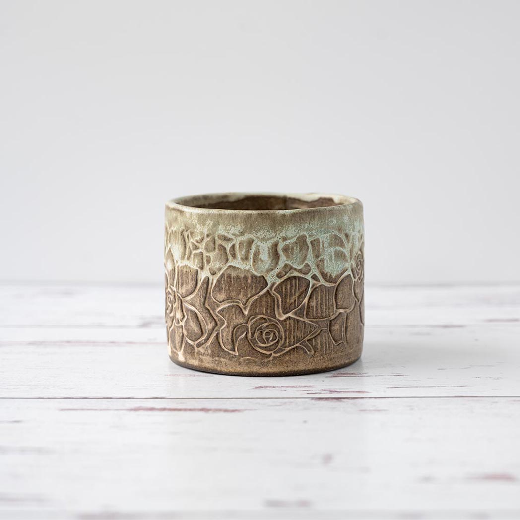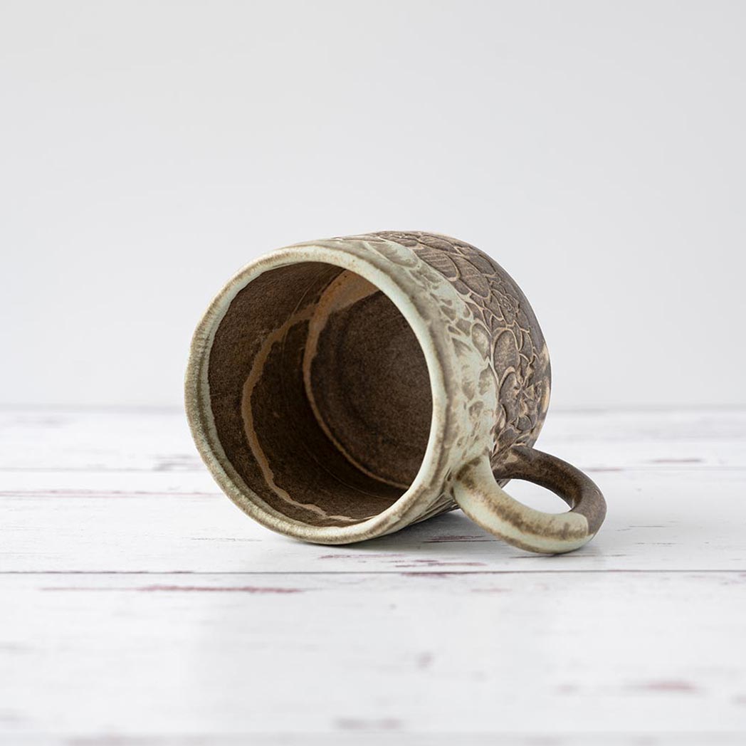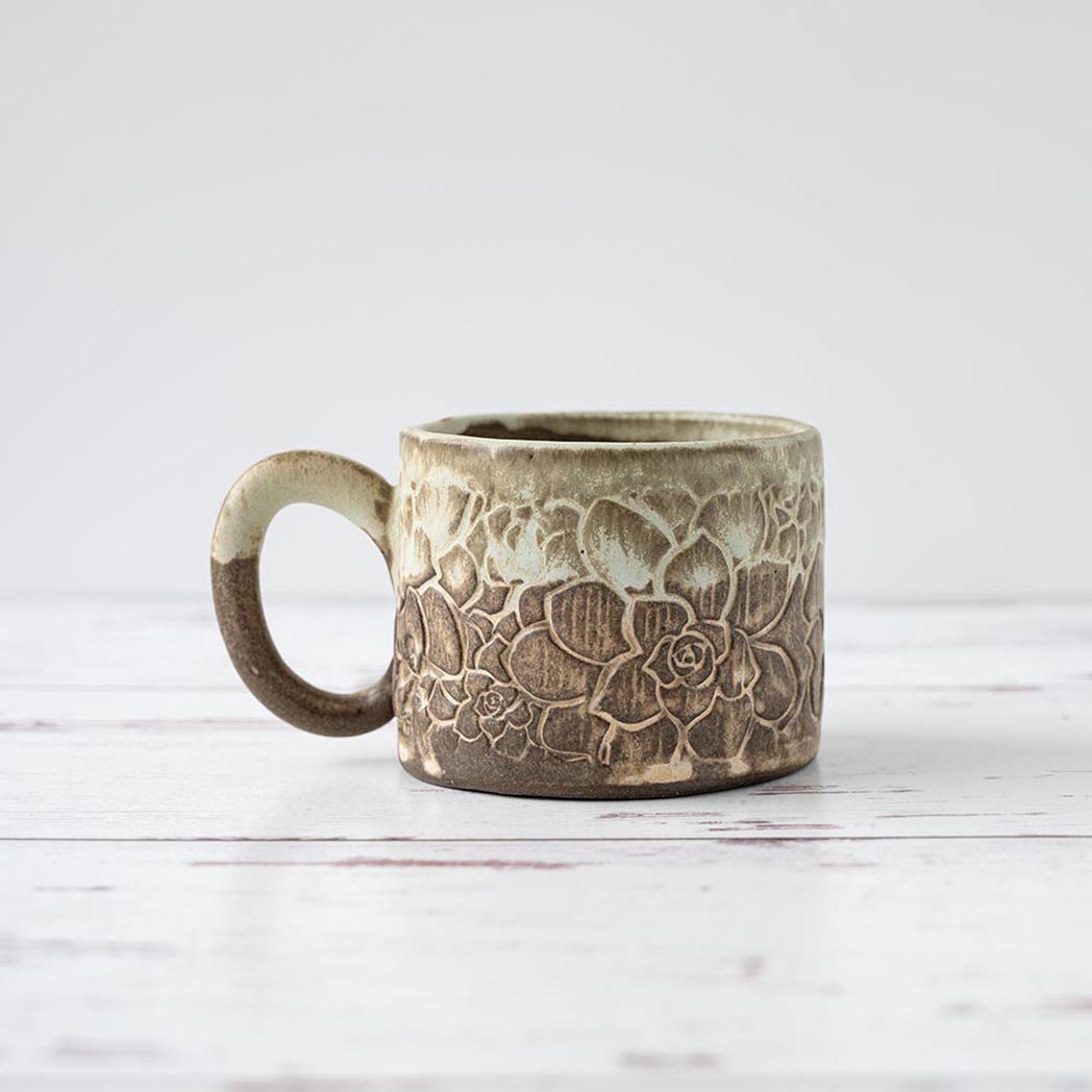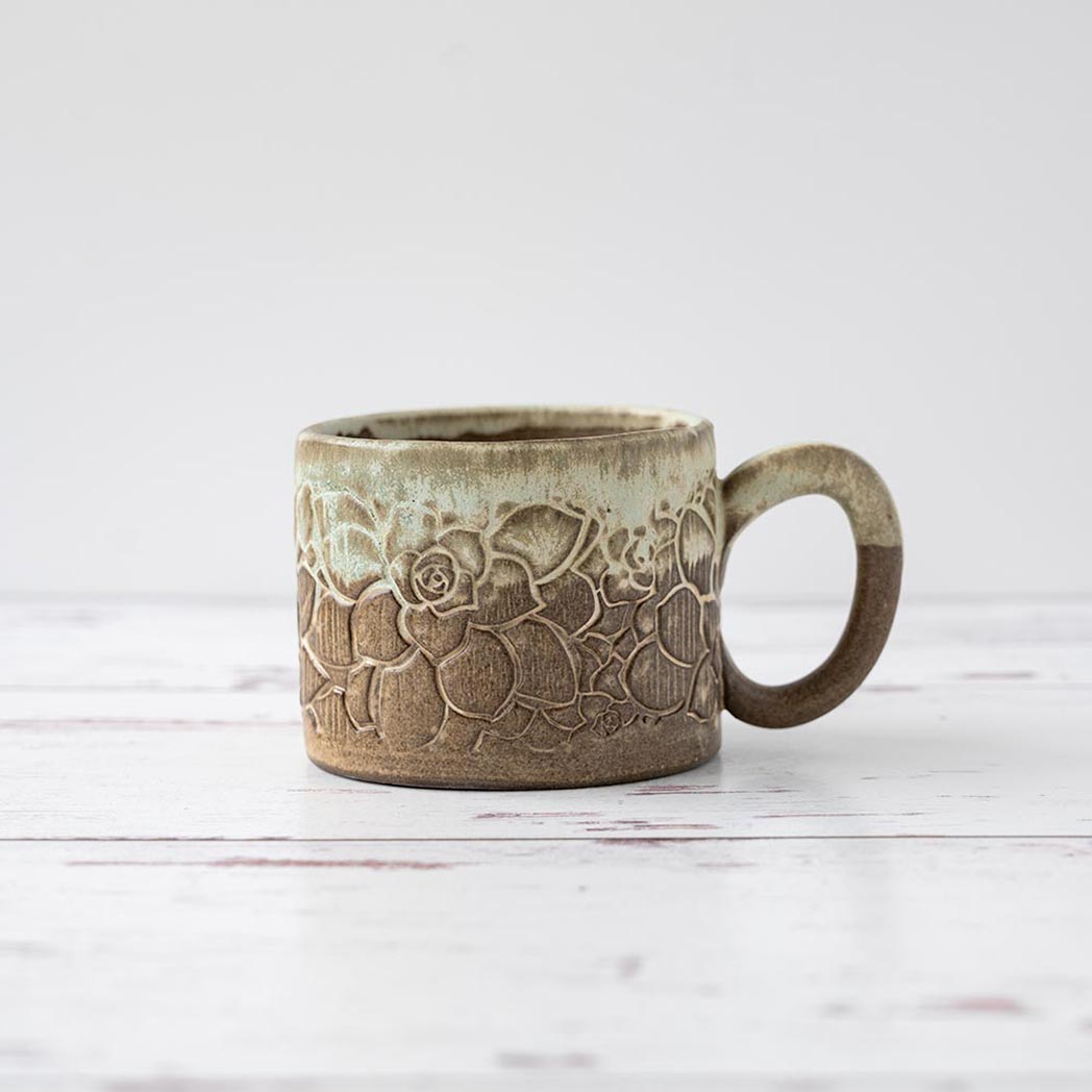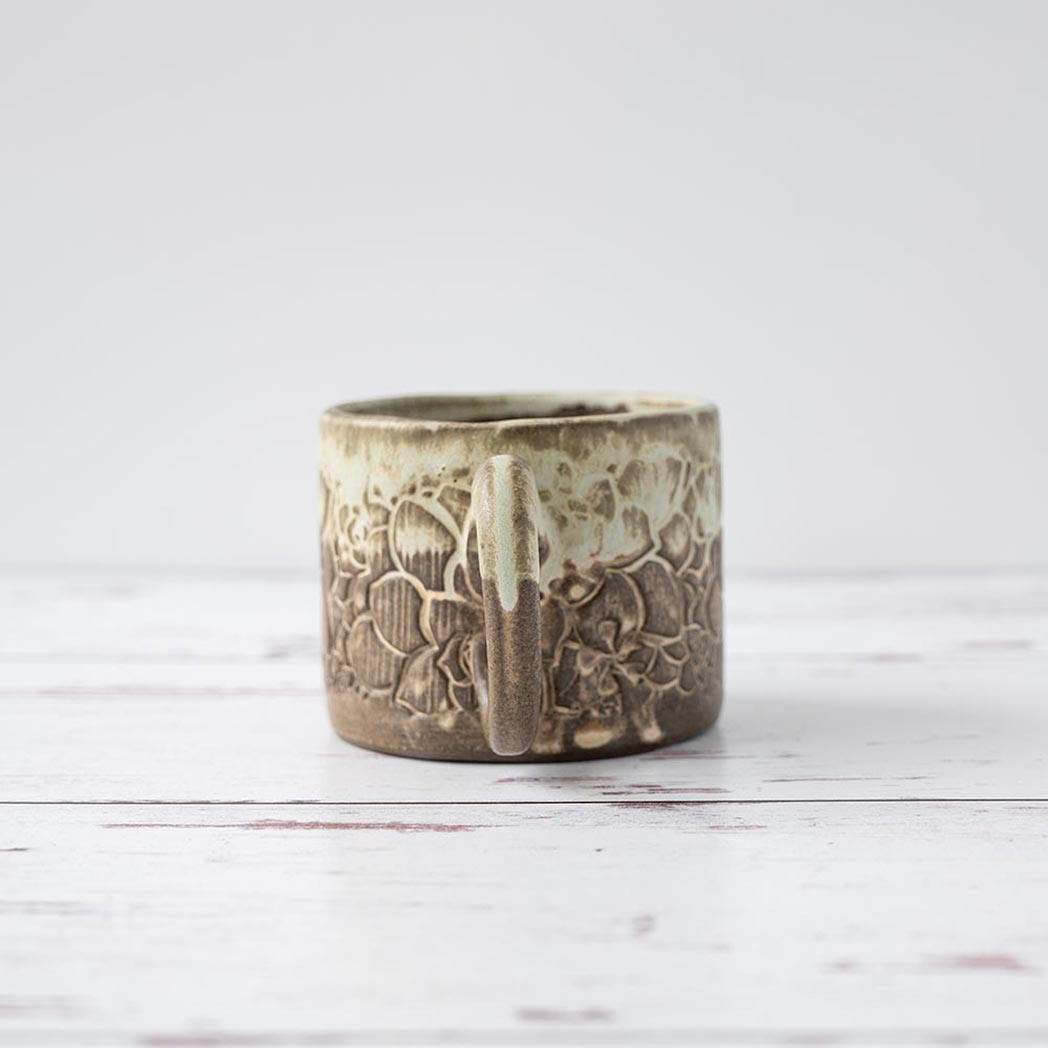 Handmade in Ohio, this beautiful white stoneware ceramic green succulent mug brings a rustic green and yellow vintage pattern to your mug collection. Enjoy approximately 8 oz. of your favorite coffee or tea in this unique hand-glazed mug which is both microwave and dishwasher safe.
