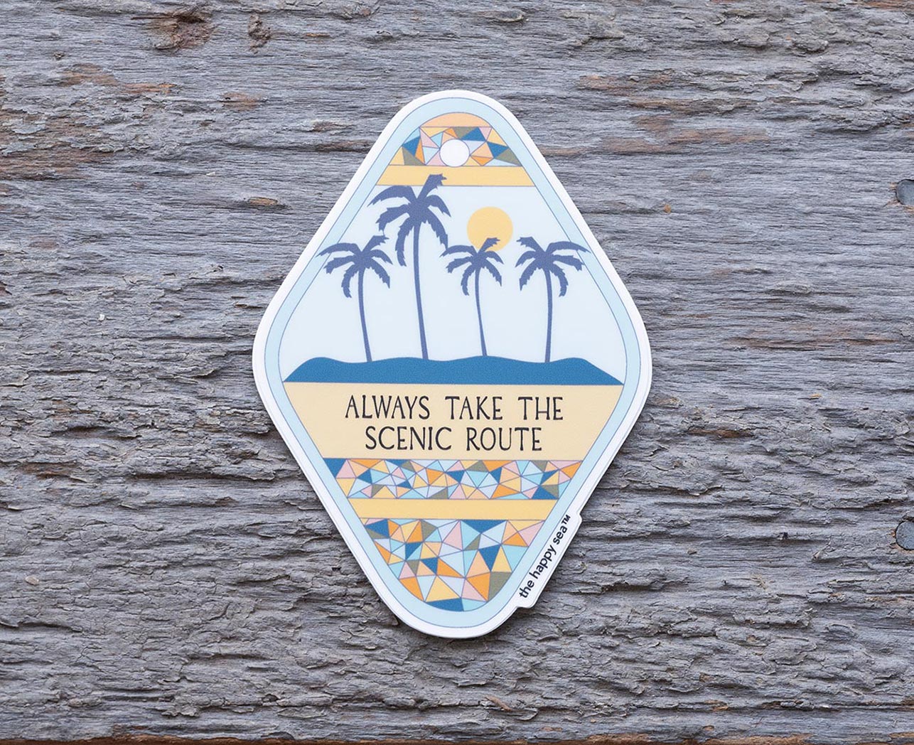 Bring the inspiration of taking your time, explore and taking the scenic route to your tumbler, laptop, window, surfboard and anything you can imagine with the the Happy Sea Scenic Route Sticker. Designed with a colorful vintage print, the 3″ Scenic Route Sticker by the Happy Sea is made of durable weather resistant vinyl to protect from the rain, sun and wind. Always American made with a portion of their proceeds to ocean conservation, make these The Happy Sea stickers pretty special.