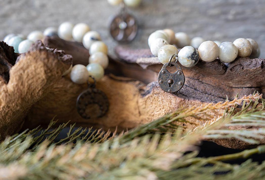 Your new bracelet comes with a healing stone property card and is available with a vintage cross & Swarovski crystal, bumpy moon or vintage lock.