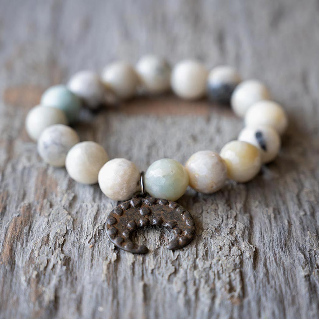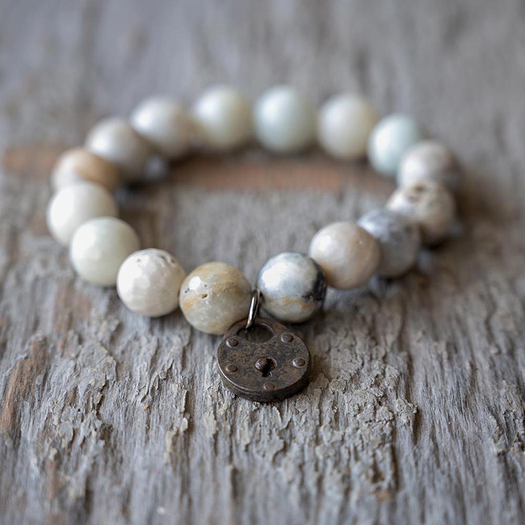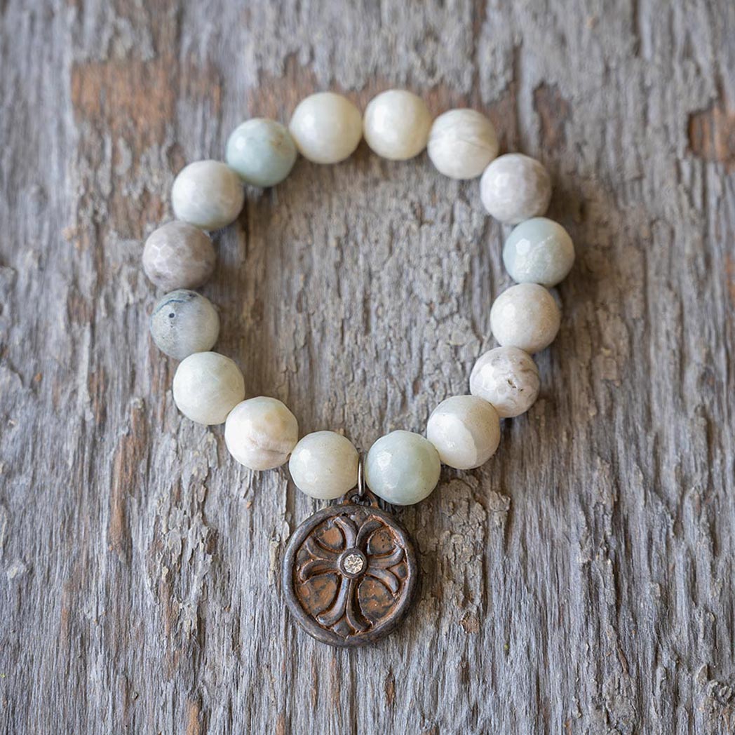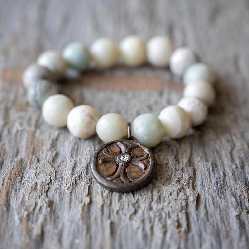 The VB&CO Designs Amazonite beaded bracelet with charm is simple but beautiful. The gold colored hand casted charm is made from actual vintage medallions and is a perfect match for amazonite beaded bracelet made of 10mm semi-precious beads.