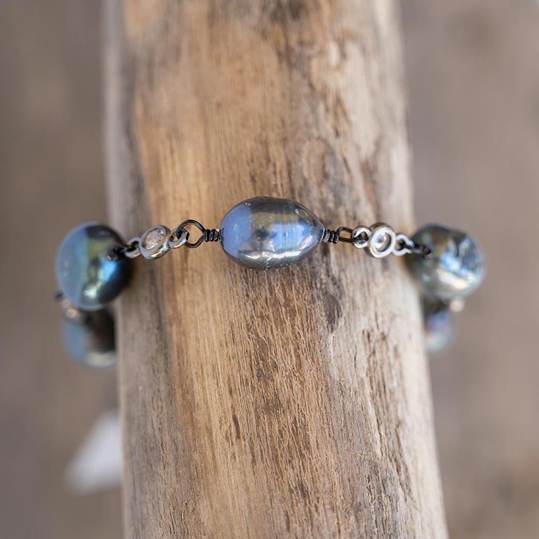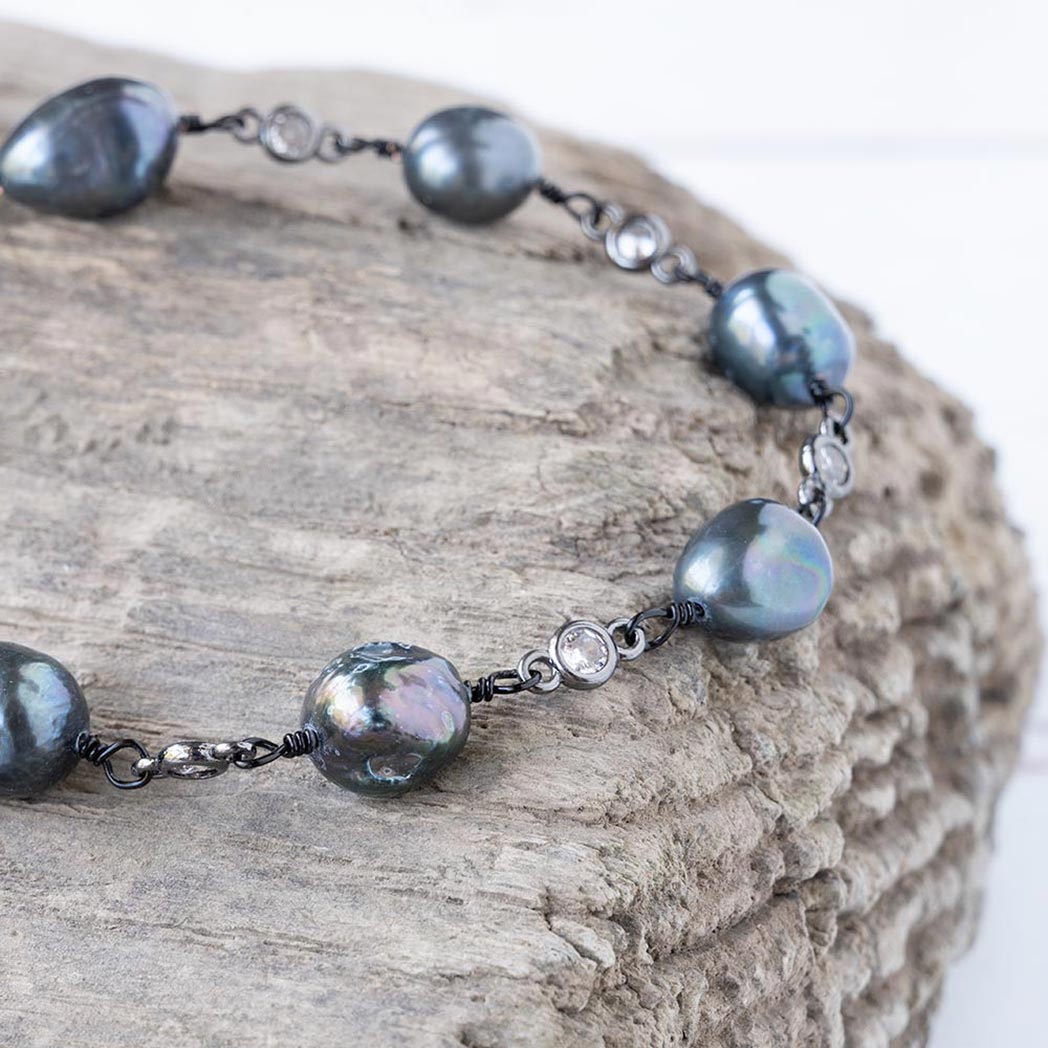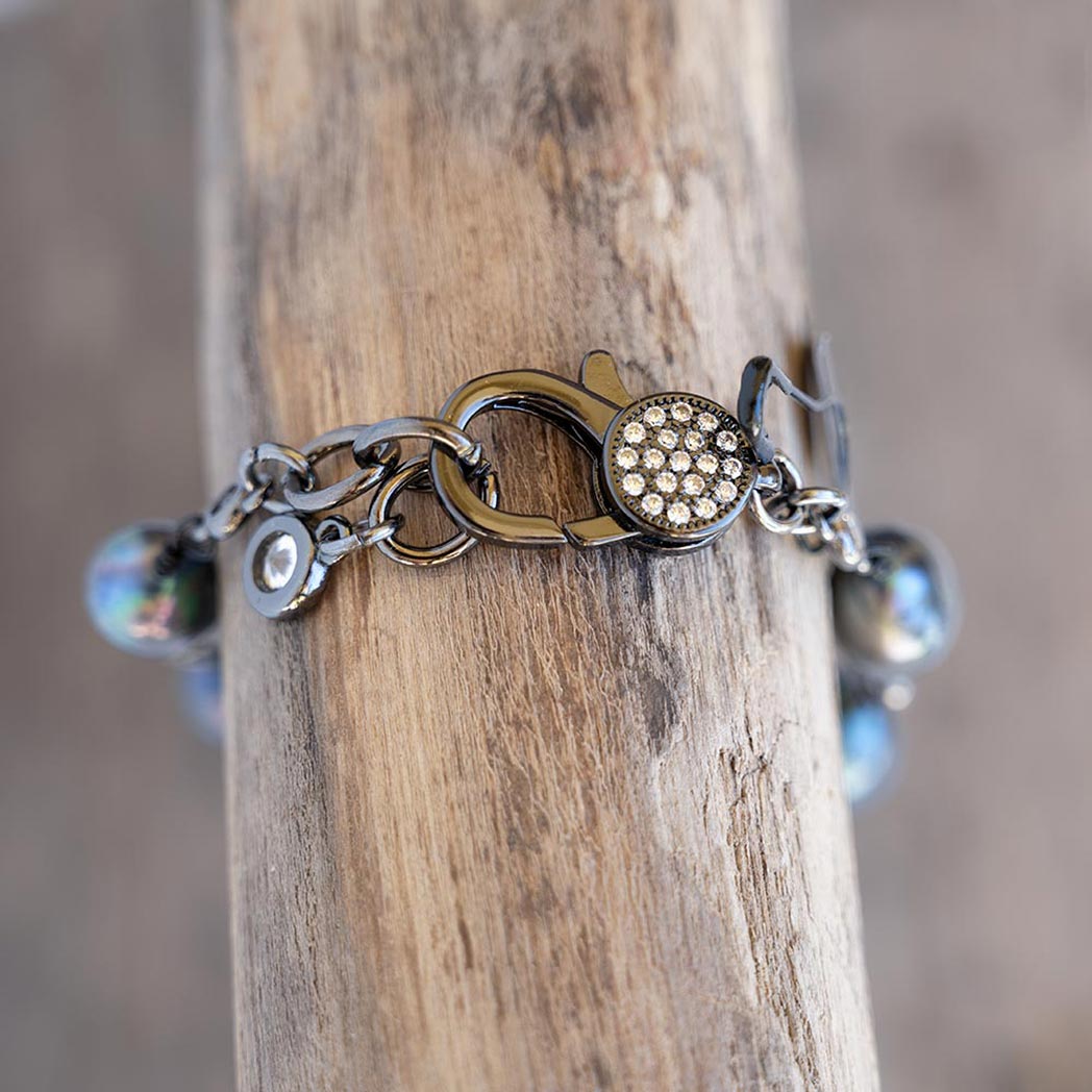 Immerse yourself in the coastal charm of the beach and sea with the Coastal Beach Pearl Bracelet. Handmade in Illinois with freshwater pearls connected along a gunmetal chain adorned with clear gems, the peacock colored bracelet is inspired by the beach and brings a touch of edgy elegance to your jewelry collection.