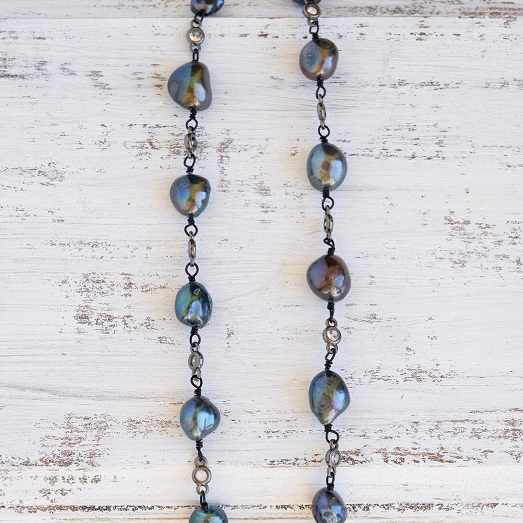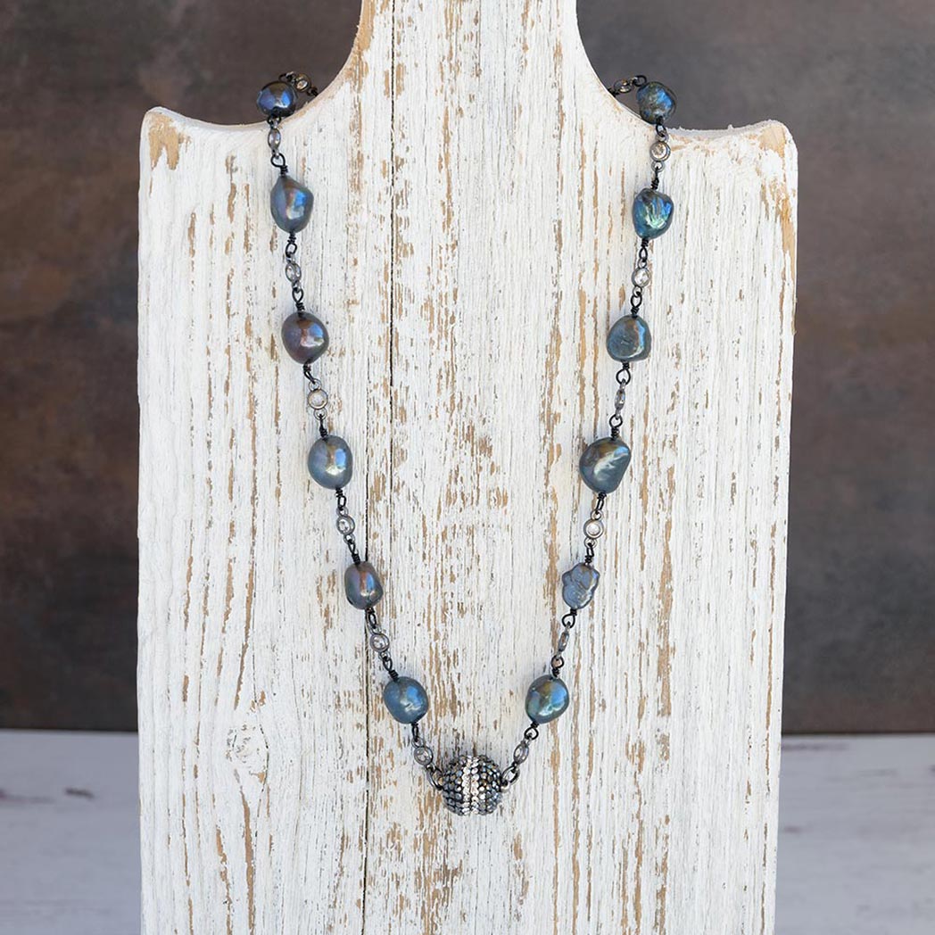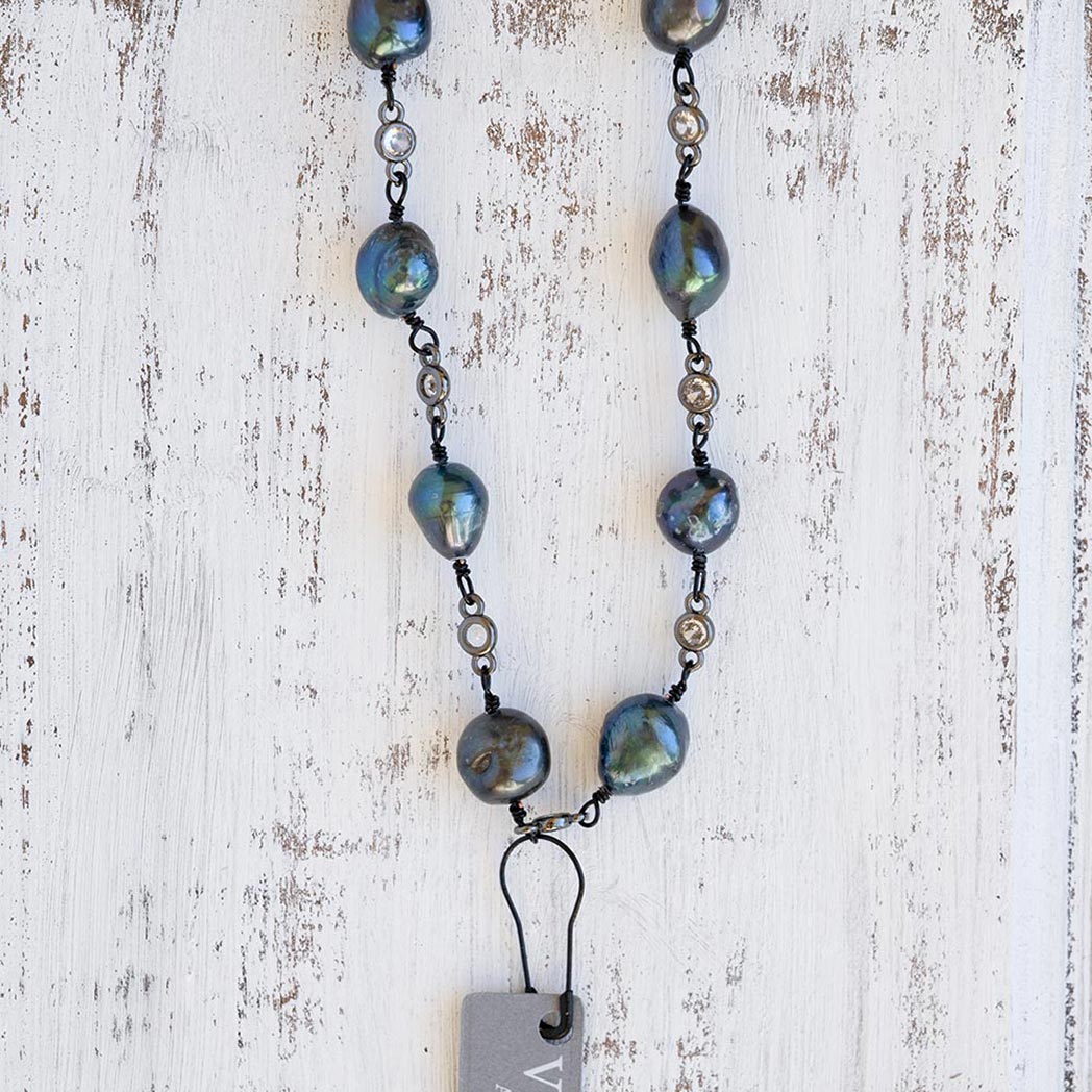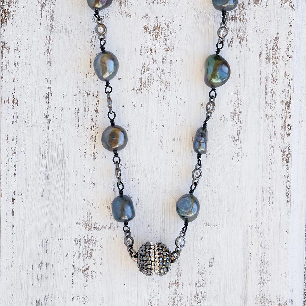 Welcome the Coastal Beach Pearl Necklace to your jewelry collection with it’s unique and beautiful look. Combining colorful pearls with a gunmetal chained connected with clear gems, the necklace includes a strong micropave magnetic clasp which you can where as a glam piece in the front or behind your neck for a classic look.
