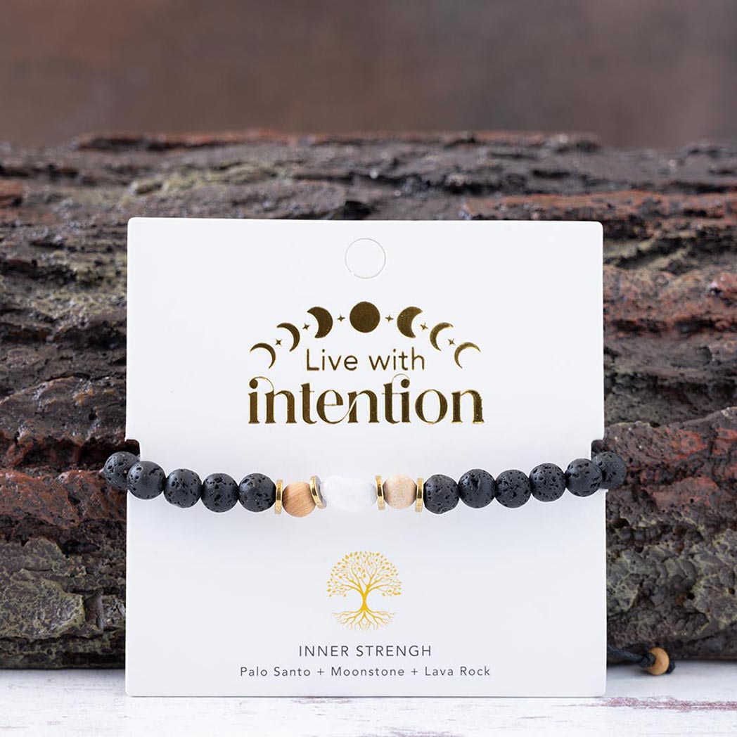 Activate the power of intention with the Inner Strength Palo Santo Moonstone Bracelet. The beautiful bracelet is handmade of lava stone, palo santo wood beads and a moonstone healing bead. The bracelet is a reminder to be present and mindful of thoughts, while living intentionally in the direction of a greater purpose.