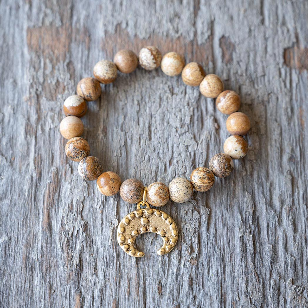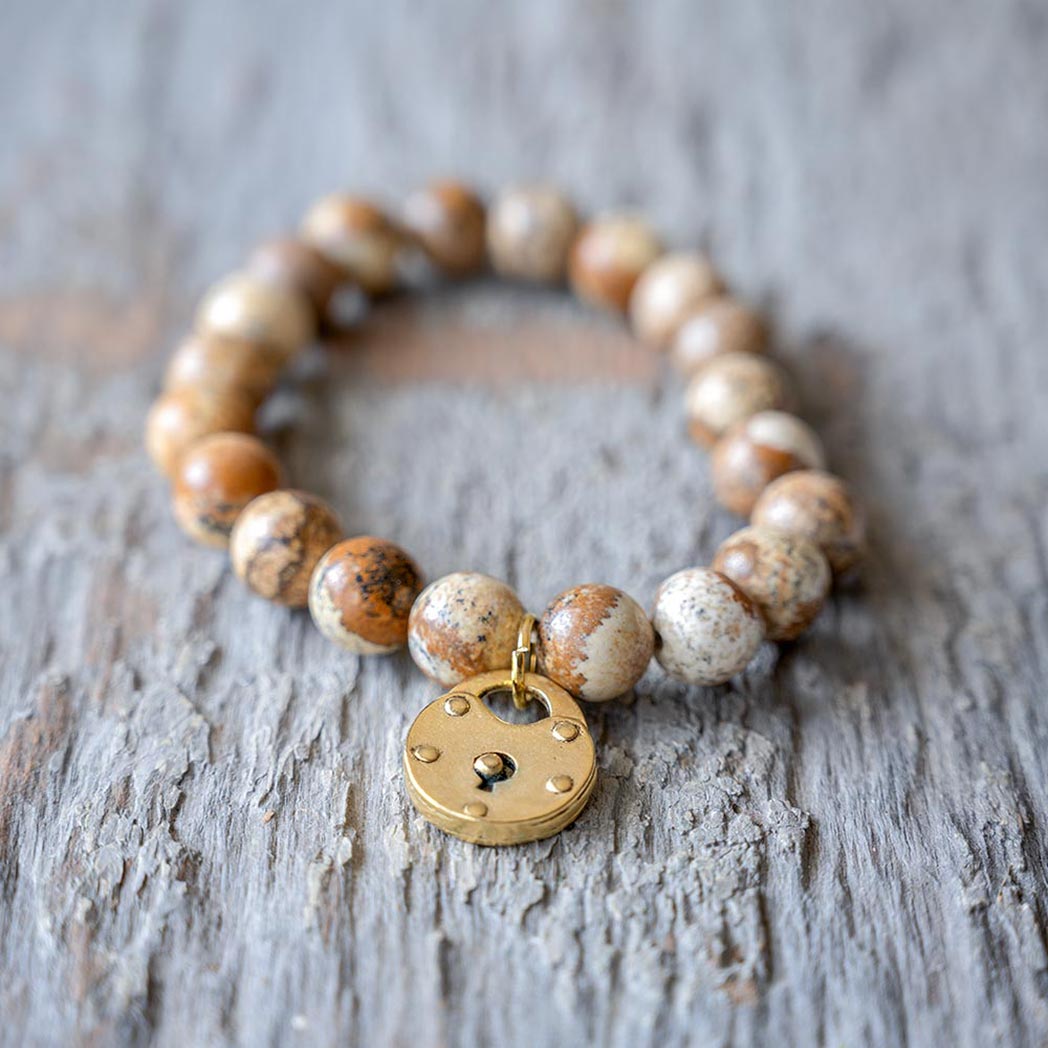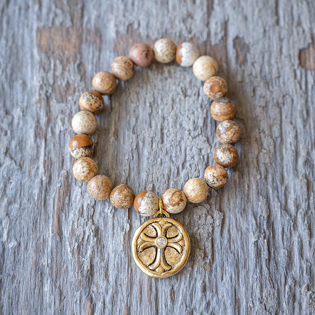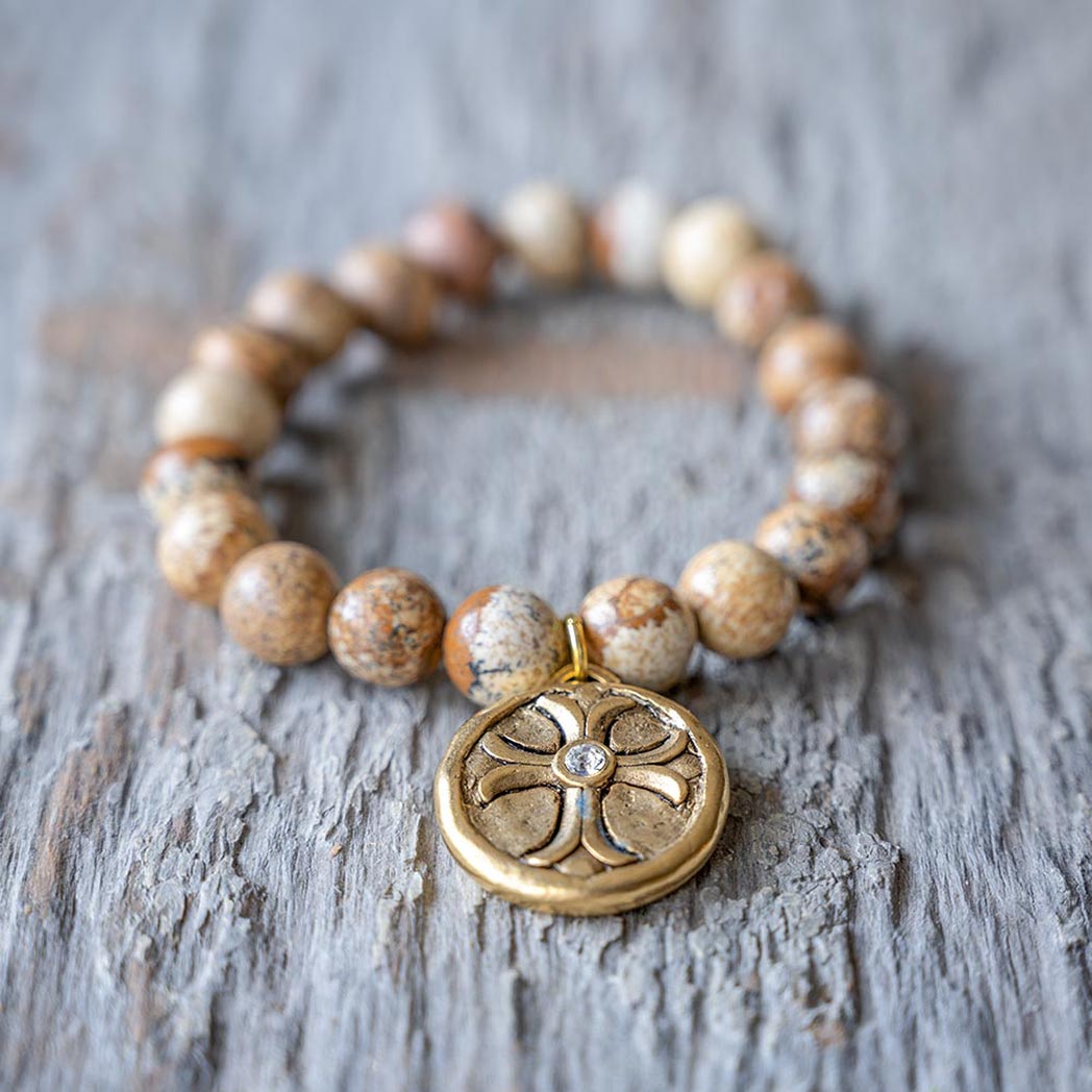 The VB&CO Designs scenic jasper beaded bracelet with charm is simple but beautiful. The gold colored hand casted charm is made from actual vintage medallions and is a perfect match for the labradorite beaded bracelet made of 10mm semi-precious beads.