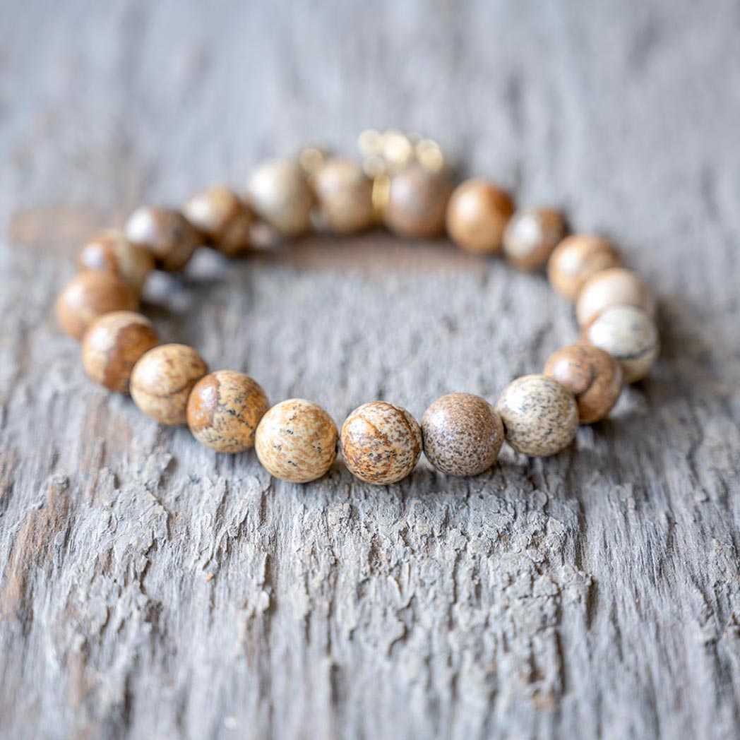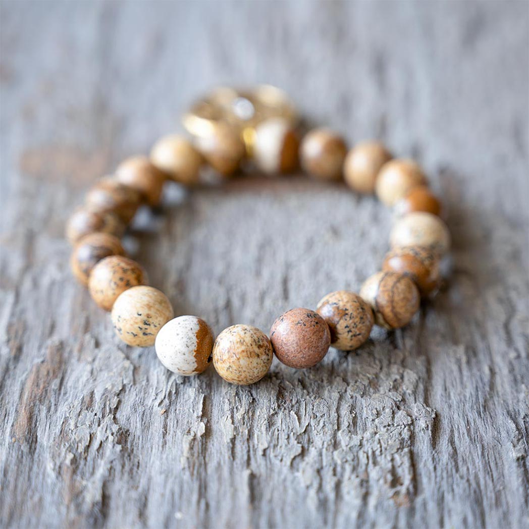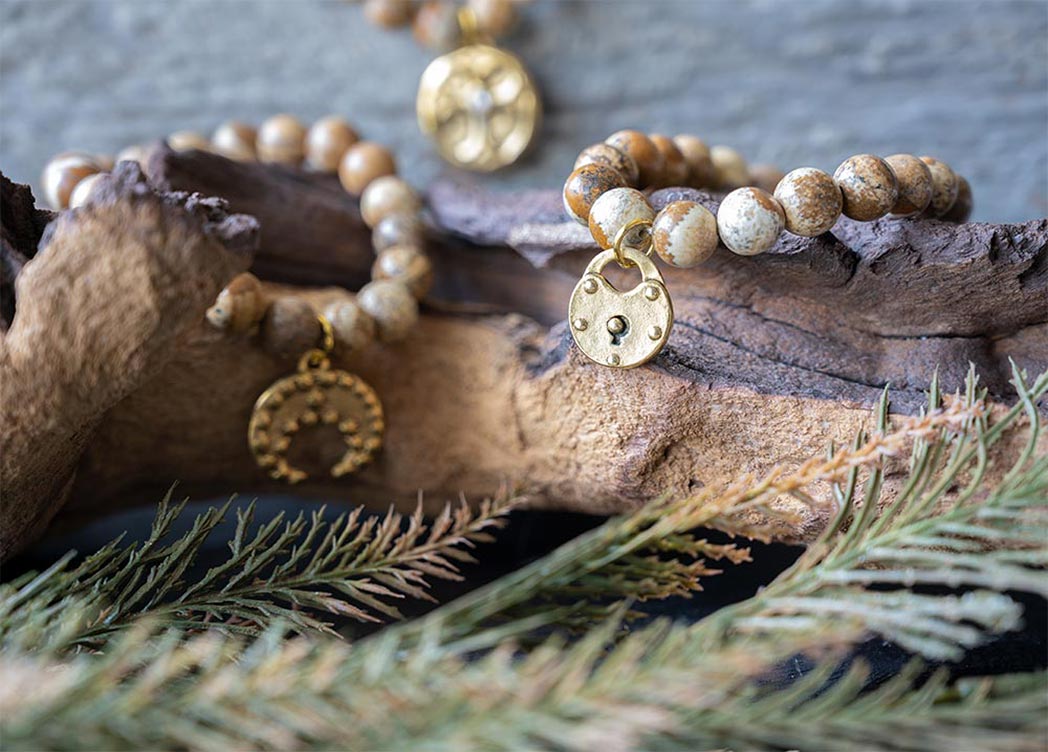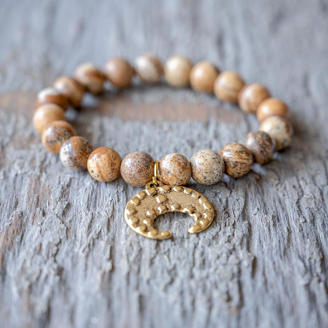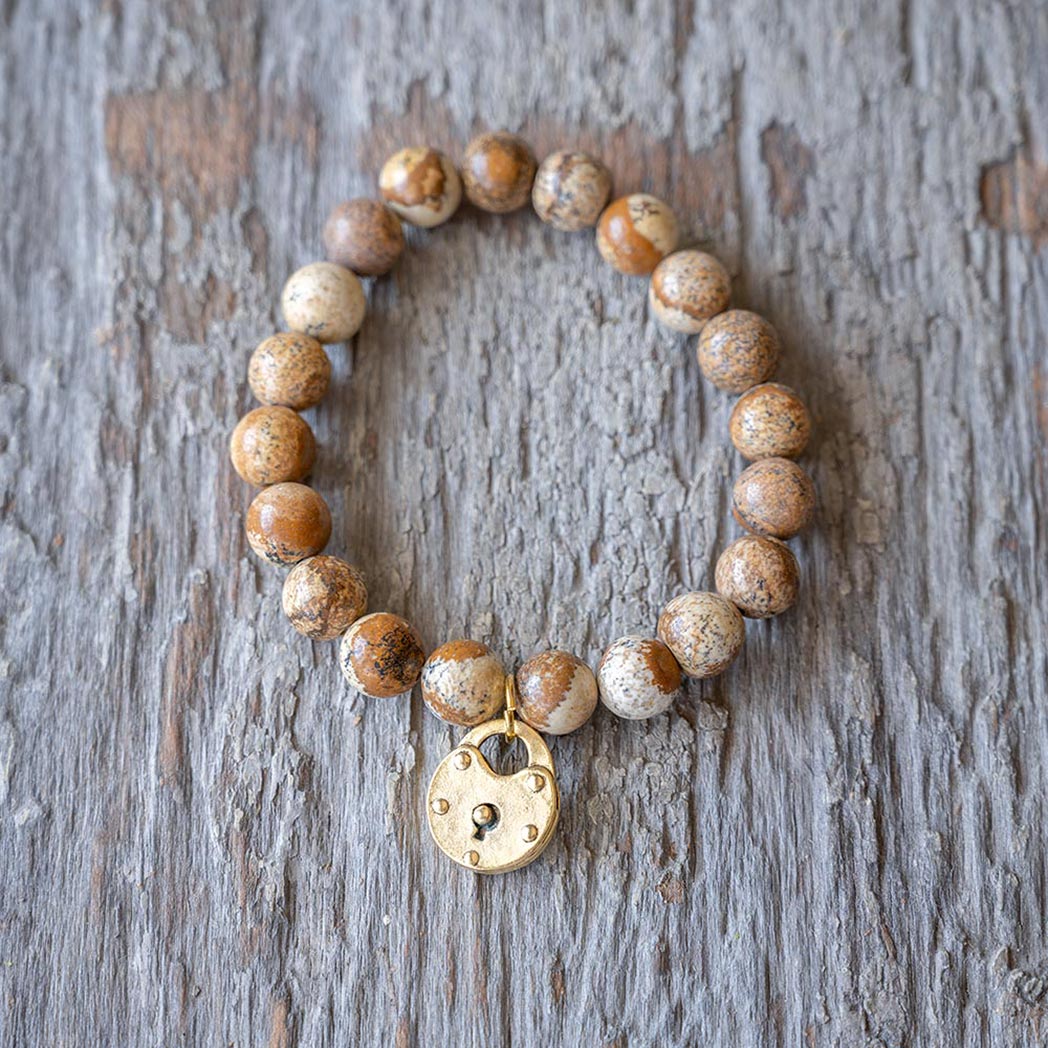 The VB&CO Designs scenic jasper beaded bracelet with charm is simple but beautiful. The gold colored hand casted charm is made from actual vintage medallions and is a perfect match for the labradorite beaded bracelet made of 10mm semi-precious beads.