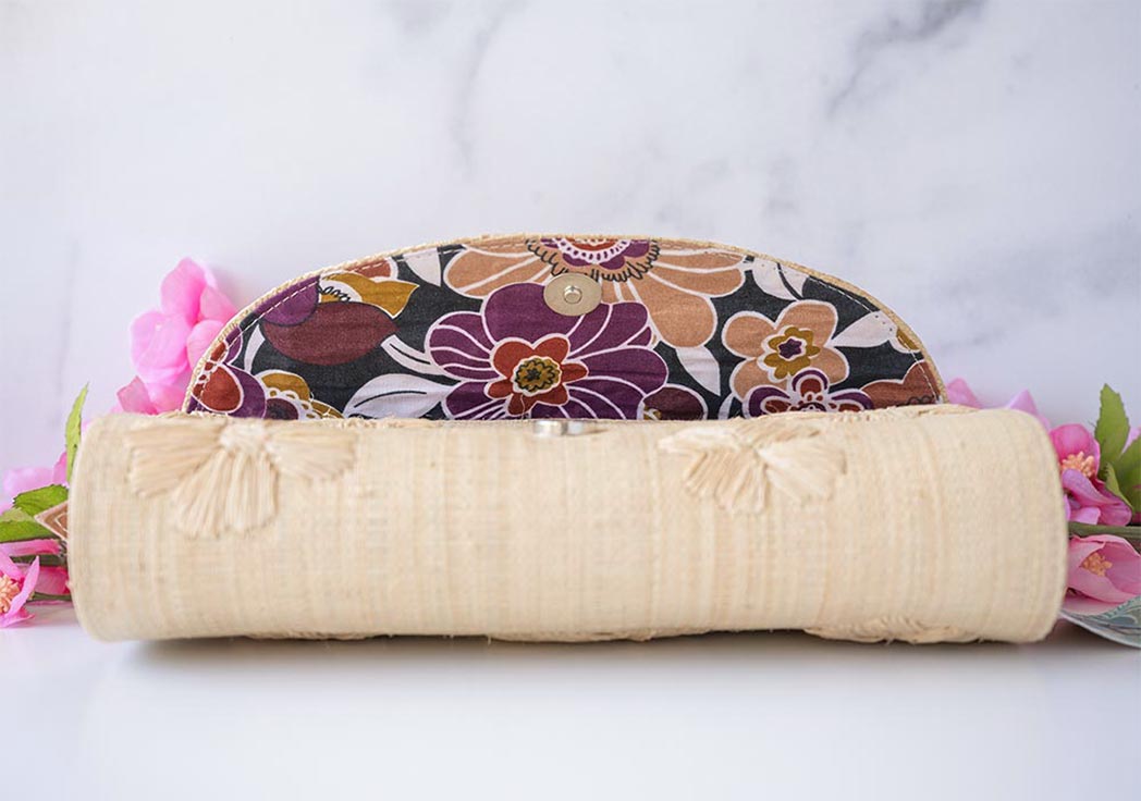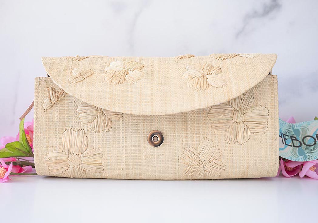 The Shebobo Tulum Flower Crossbody Bag is a cute & simple one. Handmade in Madagascar, the lightweight crossbody bag offers a raffia style purse with hand embroidered flowers cover the clutch, which are unique to each piece. The outside includes an adjustable leather strap with a colorful African interior fabric liner, which will vary from piece to piece.